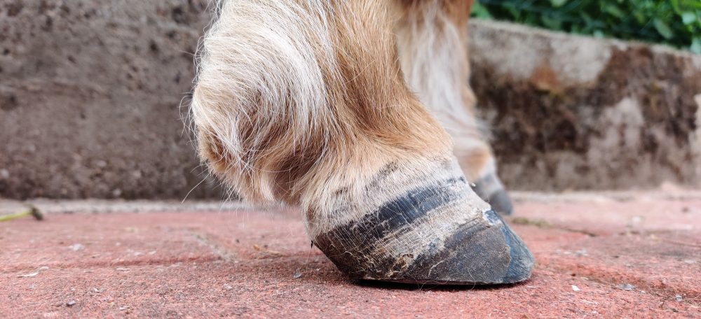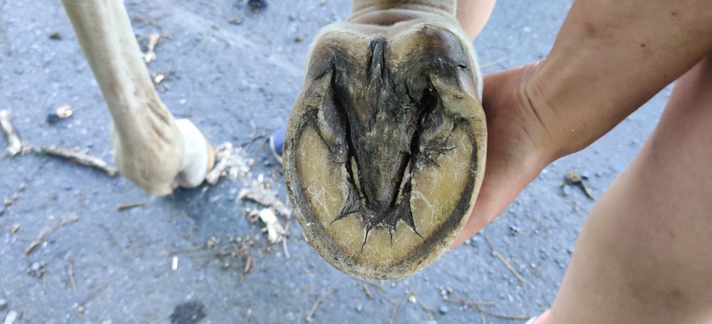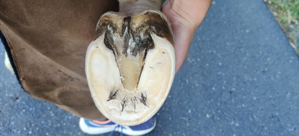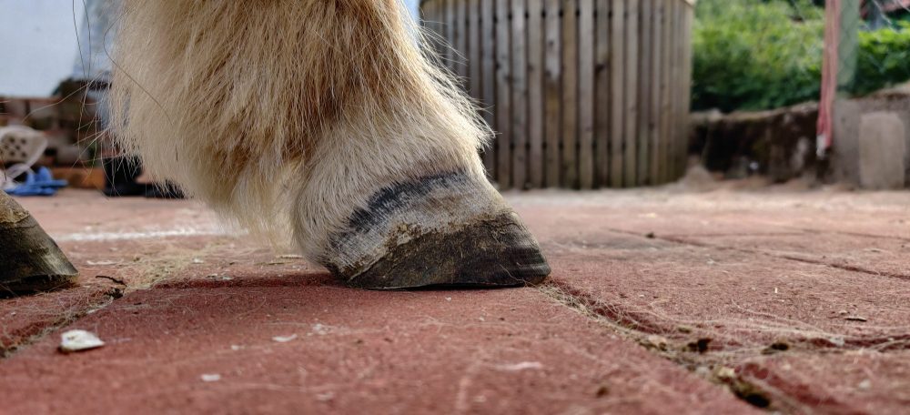 Überlange Hufe mit separierter Zehenwand. Bild 2: nach Erstbearbeitung, Bild 3: 6 Monate später